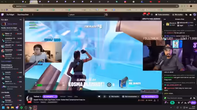 06:08:01Nach der Niederlage in Black Ops 2 wechselt das Team zu Fortnite und analysiert die aktuelle Turniersituation. Es wird festgestellt, dass nur noch ein Trio übrig ist und das eigene Team das einzige Squad darstellt. Die Stimmung ist gemischt, während über die Strategie und die verbleibenden Gegner diskutiert wird. Es wird erwähnt, dass das Team in den vorherigen Runden „gefickt“ wurde und die Gegner in den Ecken hocken. Trotzdem versuchen die Spieler, sich zu motivieren und die nächste Runde anzugehen. Die Diskussion dreht sich auch um die Qualifikationspunkte für das Turnier, wobei 300 Punkte als Richtwert genannt werden. Es herrscht Unsicherheit, ob das Team bereits qualifiziert ist oder noch weitere Punkte benötigt.