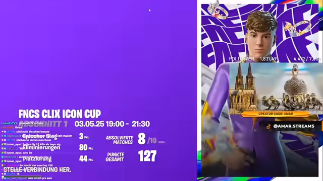 00:32:02Der Streamer startet gemeinsam mit Reason in den Klix Cup. Beide landen zusammen in einem Gebäude mit viel Loot, wie Chests und einem Automaten. Sie arbeiten als Duo zusammen, tauschen Waffen und Items wie Impulse, Beeren und Chuggie aus. Der Streamer kommentiert das Gameplay live, gibt seinem Mate Anweisungen und beschreibt ihre Kämpfe. Sie erleben einige intensive Firefights, in denen Gegner getötet und ihr eigener Mate vorübergehend ausgeschaltet wird. Trotzdem hält sich das Team tapfer und schafft es, sich in der Runde zu behaupten und Top-Platzierungen zu erreichen. Der Streamer ist von der Spielweise mit 'Simple Edit' begeistert und findet sie deutlich spaßiger als das normale Gameplay.