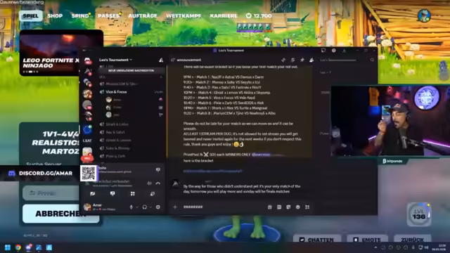 01:15:27Die Übertragung des Turniers wurde im Stil einer Viewing-Party gestaltet, bei der der Streamer die Spiele live kommentierte und die Interaktion mit dem Chat stark im Fokus stand. Es wurden Wetten zwischen den Spielern angestoßen, wie zum Beispiel eine Wette mit 5 Subs über den Ausgang eines Matches. Währenddessen diskutierte der Streamer die Spielstrategien und kritisierte teilweise defensive Taktiken. Parallel dazu wurden verschiedene Produkte wie Skins und Emotes aus dem Fortnite-Shop beworben, wobei der eigene Creator Code zum Einsatz kam, um die Community zu unterstützen und die Einnahmen zu steigern.