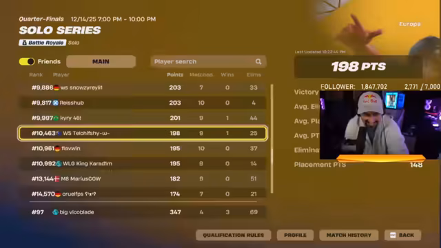 03:16:50Nach einer erfolgreichen Runde ('W-Tylee') wird die Vorfreude auf das endgültige Leaderboard ausgedrückt. Es folgt eine Analyse der Konkurrenz: Mali liegt an erster Stelle, gefolgt von Flixi und Fastroki. Weitere bekannte Namen wie Noah, Pixi und Sky werden genannt. Die Diskussion dreht sich um die Chancen für die Heats-Qualifikation und die Überraschung über den schnellen Turnierabschluss.