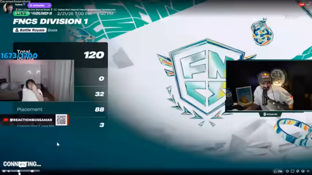 00:06:54Der Streamer spricht über die Teilnahme am FNCS Division 1VP-Turnier und analysiert die Leistung von Teams wie Sky und Scroll. Er kritisiert, dass zu viele Spieler zu defensiv ("Pussy") spielen und folglich bessere Ergebnisse erzielt hätten, wenn sie aggressiver agiert hätten. Die Platzierungen und Ergebnisse der Teams werden live im Stream verfolgt und kommentiert, mit einem Fokus auf die deutsche Dominanz und die Performance der angetretenen Duos.