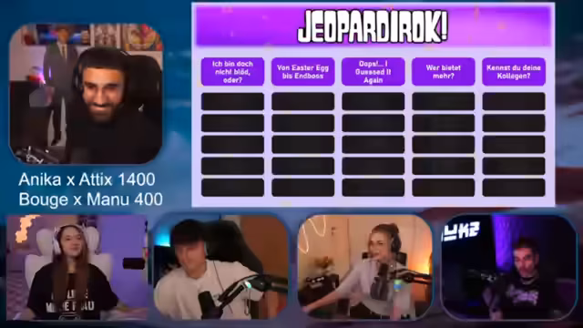 00:19:06Das Hauptformat des Abends, 'Jeopardy-Rocket', beginnt. Es ist ein Team-Quiz für zwei Zweier-Teams, Annika/Attics und Bouget/Manu. Die Regeln werden erläutert: Teams wählen Kategorien, buzzen für Antworten, können bei Falschantworten Minuspunkte riskieren oder das gegnerische Team abstauben lassen lassen. Die Kategorien umfassen Gaming, Musik, allgemeines Wissen und Fragen zu Streamer-Kollegen. Das erste Spiel, 'Wer bietet mehr', startet mit der Frage nach den deutschen Fußballmeistern seit 1963.