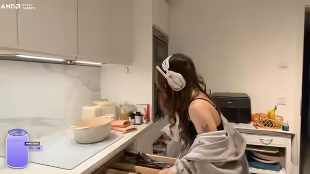 00:51:00Während einer kurzen Pause, in der die Teilnehmer auf die Weiterführung des Turniers warten, bereitet die Streamerin ihr Mittagessen zu, eine Variante von Kroketten. Der Vorgang wird detailreich gezeigt und kommentiert. In dieser Zeit führt sie persönliche und allgemeine Gespräche mit dem Chat, unter anderem über ihr Make-up, geschäftliche Kooperationen und die Behandlung anderer Menschen. Nach dem Essen geht sie zurück zum Spiel.