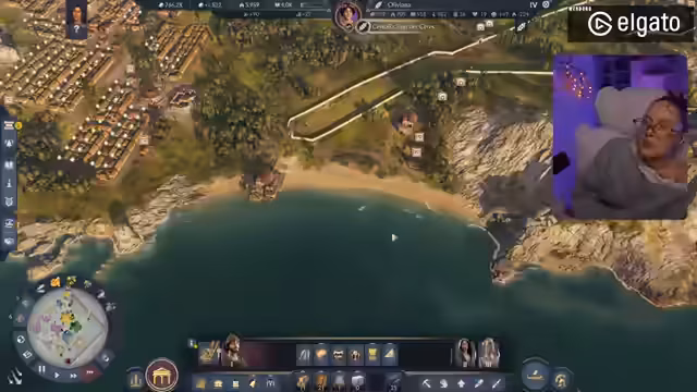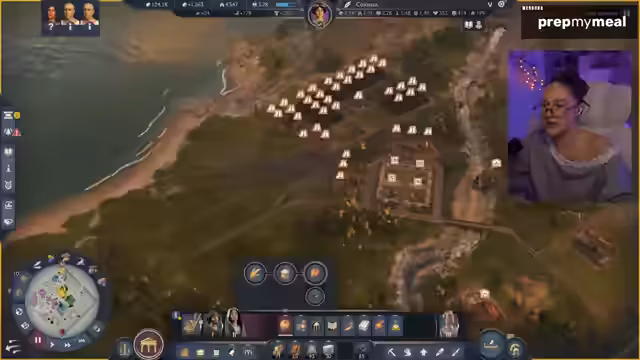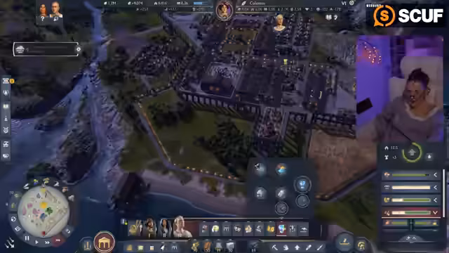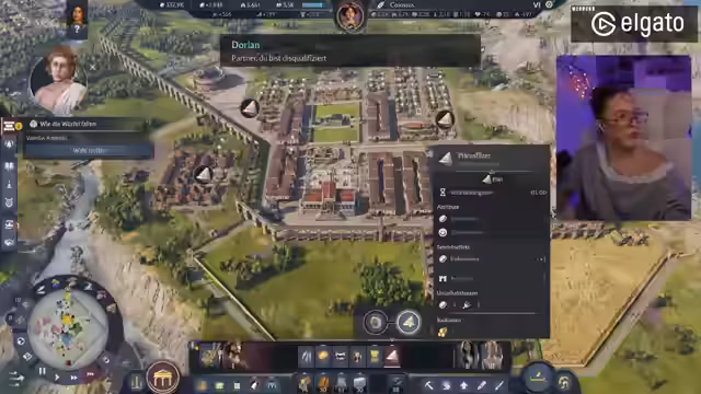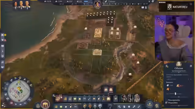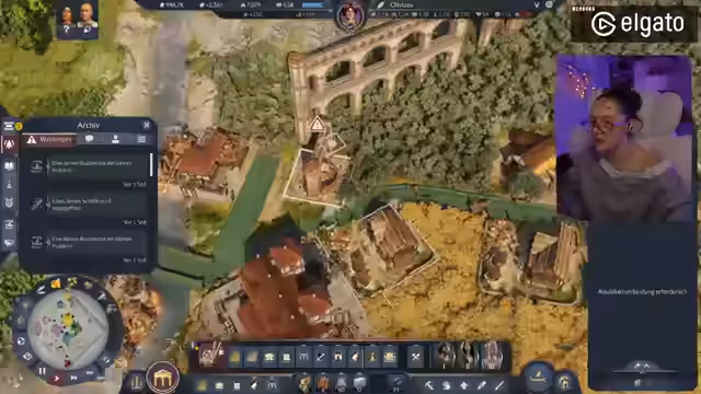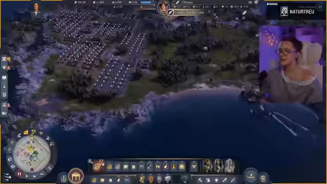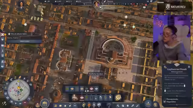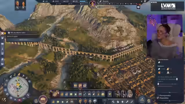 00:58:59Die Streamerin präsentierte ihre in Anno 177: Pax Romana erbaute Stadt, die sie am Vortag verschönert hatte. Sie erklärte, dass sie sich entschieden hatte, die Grundbedürfnisse wie Haferbrei und Brot auf jeder Insel direkt zu decken, anstatt sie von anderen Inseln zu importieren, um ein ästhetisch ansprechenderes Bild mit Feldern zu schaffen. Sie zeigte die Anlegestelle, das Kontor und die Warft als Eingangsbereich zur Insel. Anschließend führte sie durch die Stadt, beginnend mit dem Aquädukt und dem für 50.000 Dollar freigeschalteten Forum, das sie als sehr schön gelungen empfand, inklusive des Offiziums und eines Theaters. Über eine Brücke gelangte sie zum zweiten Distrikt, wo sich ihre Villa befand. Dort hatte sie zwei kleine Felder angelegt, die zum Spazierengehen einluden, und betonte ihre Vorliebe für die römischen Mauern, die der Stadt ein authentisches Aussehen verliehen.