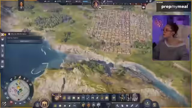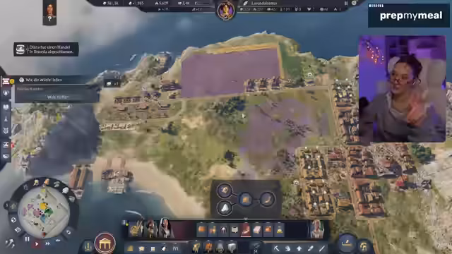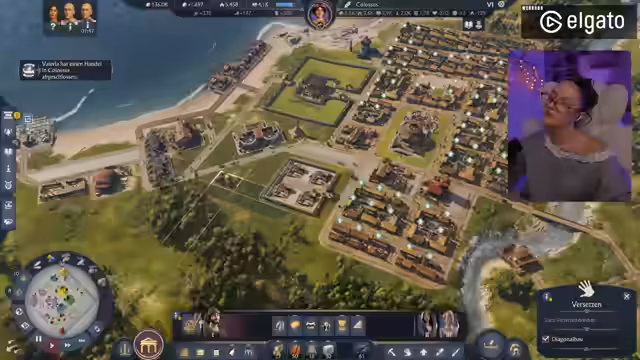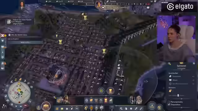 01:43:43Der Fokus verlagert sich von der Wohnbebauung zur industriellen Produktion. Produktionsgebäude für Güter wie Salz, Garum und Ziegel werden platziert und mithilfe von Lagern und Straßen vernetzt. Der Streamer optimiert den Handel, indem er festlegt, bei welchen Lagerbeständen Waren verkauft oder eingekauft werden sollen, um Engpässe zu vermeiden und Gewinne zu maximieren. Er stellt sicher, dass jede Produktionskette effizient mit Rohstoffen beliefert wird und die Endprodukte über den Hafen verschifft werden können.