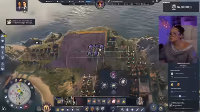03:47:47Nachdem die grundlegende Produktion auf der Insel Lavendula wieder läuft, widmet sich die Streamerin der Steigerung der Zufriedenheit der Bevölkerung und der Verbesserung der Infrastruktur. Sie richtet ein Fest aus, um die Moral zu heben, und installiert eine Feuerwache, um die Brandsicherheit zu erhöhen. Ein zentrales Thema ist die langsame Produktivität bestimmter Betriebe, was sie durch die Neuanordnung der Gebäude und die Verbesserung der Straßenanbindung zu beheben versucht. Gleichzeitig beginnt sie, ihre Forschung voranzutreiben, um neue Technologien wie erhöhte Bauernfernung von der Küste und Kaimauern freizuschalten, die ihre Handels- und Verteidigungsfähigkeiten verbessern sollen.