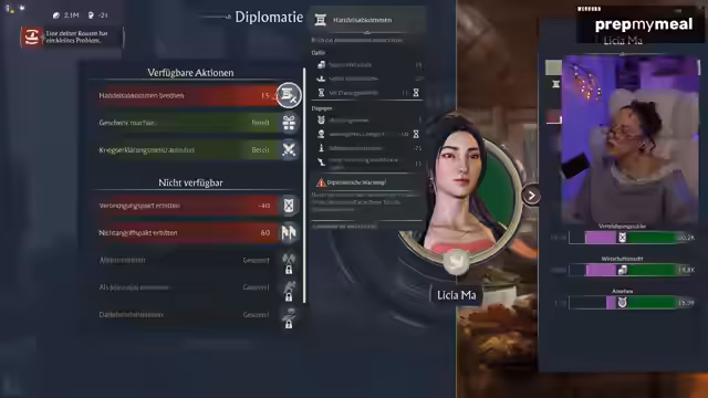02:08:18Ein neues Thema im Stream ist die Diplomatie mit benachbarten Völkern. Der Streamer präsentiert die bestehenden diplomatischen Beziehungen, darunter einen Verteidigungspakt, Frieden und einen Waffenstillstand mit einem anderen Volk. Er erwägt aktiv die Anbahnung neuer Handelsabkommen und Verteidigungspakte, um die Position seiner Insel zu stärken und eventuelle Kriege zu verhindern. Er erkennt jedoch an, dass die Aufgaben dafür schwierig sein könnten und plant, seine Diplomatie strategisch zu planen.