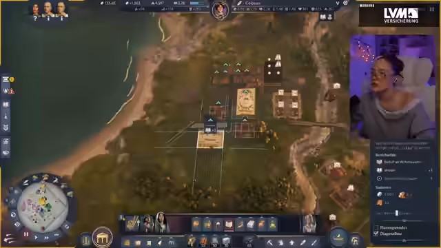 02:48:05Die Aufmerksamkeit verlagert sich auf den Städtebau und die Anordnung der Gebäude für eine optimale Performance und Ästhetik. Besonders die Positionierung der fünf benötigten Tuniken-Shops wird diskutiert, da sie zwar positive Effekte auf Einkommen und Wissen, aber auch Platz beanspruchen. Die Streamerin experimentiert mit verschiedenen Layouts und stellt fest, dass die Gebäude nicht gestapelt werden können. Gleichzeitig muss sie sich mit praktischen Problemen auseinandersetzen, wie fehlende Lagerhäuser, die Versorgung mit Steinen für Steinstraßen und unzufriedene Bürger. Sie beschließt, ihren Fokus funktionalen, aber auch optisch ansprechenden Anordnungen zu widmen, was zu einem ständigen Refinieren des Stadtbildes führt.