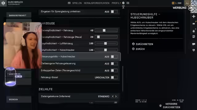 01:06:18Der Streamer diskutiert die Steuerung von Fahrzeugen, insbesondere Helikoptern, und die Schwierigkeiten, diese zu meistern. Er probiert invertierte Steuerung aus. Gleichzeitig versucht er, die Entfernungseinstellungen seines Sniper-Gewehres zu verstehen, um präzisere Schüsse abfeuern zu können. Er fühlt sich mit der aktuellen Technik jedoch unwohl und überfordert.