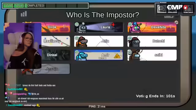 02:41:02Nach dem Ende der Runde wird das Ergebnis reflektiert. Die beiden Impostoren, Maxi und Bouget, wurden identifiziert und ausgeschieden. Eine Spielerin gibt an, dass sie gest einen Krampfanfall hatte und noch im Krankenhaus war, aber sich wieder besser fühlte. Sie bittet das Publikum, darüber zu sprechen, um das Thema zu entstigmatisieren. Auch das Thema der Zuschauerzahlen wird kurz angesprochen.
