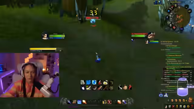 03:35:34Als Classic-Neuling ärgert sich die Streamerin über die Startgebiets-Einschränkungen für Gnome und Zwerge, die sie vom Rest der Gruppe trennen. Sie ist Level 14 und findet die Gebiete zwar hübsch, ist aber unzufrieden, nicht mit den anderen zusammen spielen zu können. Sie erfährt von Zuschauern, dass man Quests teilweise überspringen und stattdessen Mobs farmen kann, um genauso schnell zu leveln und sich die nervigen Aufgaben mit schlechten Dropchancen zu sparen.