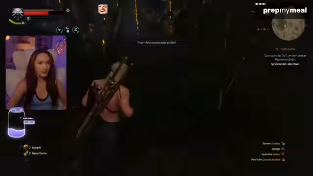 00:41:44Nachdem alle organisatorischen Punkte geklärt sind, beginnt der Streamer mit dem Spielen von The Witcher 3. Sie reist nach Weißgarten, wo sie sich zunächst mit der Steuerung und dem Inventar vertraut macht. Sie stellt fest, dass ihr Silberschwort eine hohe Abnutzung aufweist und es reparieren muss, da es für bestimmte Monster notwendig ist. Auf der Karte von Weißgarten entdeckt sie mehrere Orte, die sie erkunden möchte, darunter eine zerstörte Brücke und einen Ort der Macht, um Fähigkeiten zu verbessern.