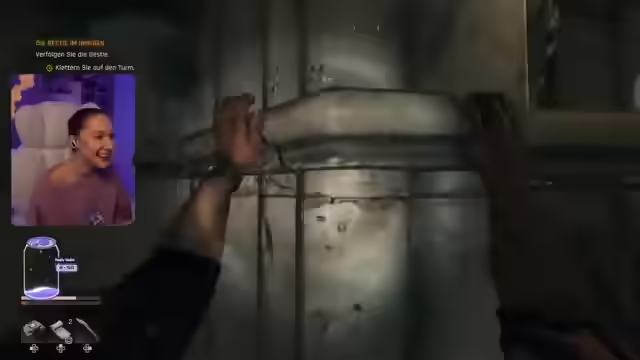 06:00:19Die Streamerin erreicht das Kraftwerk und muss irgendwie nach oben gelangen. Sie sucht im Chat nach einem 'richtig krassen Silberspieler' für ein anderes Spiel und erwähnt, dass sie morgen in einer Ascendant-Lobby spielen wird. Der Tipp eines Zuschauers hilft, einen Weg nach oben zu finden. Im Hauptgebäude des Kraftwerks angekommen, muss die Streamerin einen Weg finden, ins Innere zu gelangen, und überwindet dabei ihre Höhenangst. Nach einiger Suche wird ein Fenster entdeckt, das den Zugang ermöglicht. Die Streamerin findet einen Weg nach oben, indem sie ihre Parcours-Fähigkeiten einsetzt. Sie äußert sich verwirrt über die nächsten Schritte und sucht nach Hinweisen, wie sie in den Turbinenraum gelangen kann. Es wird ein neuer Gegenstand hergestellt: ein Dietrich. Im Turbinenraum angekommen, werden die Gegner aktiv, und die Streamerin versucht herauszufinden, warum. Sie findet eine Schlüsselkarte, die wahrscheinlich benötigt wird. Die Streamerin öffnet eine Tür und wird von einem Gegner überrascht.