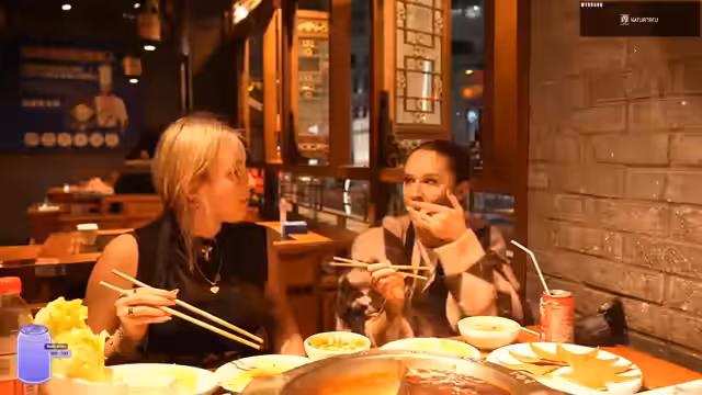01:52:44Während des Essens werden Verhaltensweisen in China besprochen, wie das Schlürfen, das als unhöflich gilt. Gleichzeitig wird eine unangenehme Begegnung von gestern Abend erwähnt, bei der sie auf einer Brücke von mehreren Männern umringt wurden. Die Situation wurde erst durch den Hinweis auf den Live-Stream beendet, was das Gefühl der Unsicherheit verstärkte.
