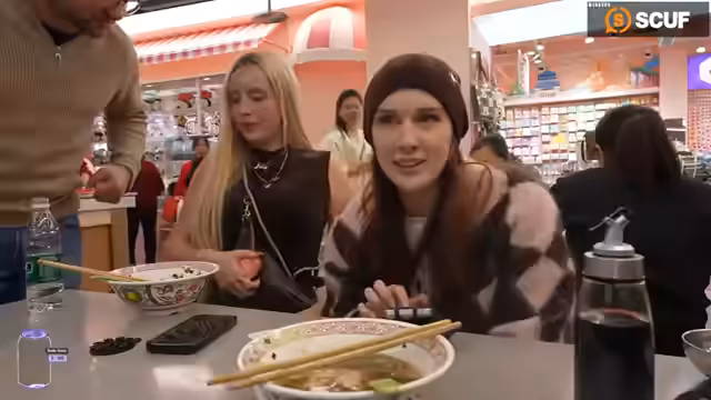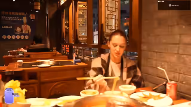 05:57:58Die Bestellung kommt und die Hotpot-Brühen werden in den Kochtöpfen erhitzt. Die Streamerin testet die verschiedenen Brühen, eine davon ist scharf. Während des Essens stellt die Begleitung Annika Kreislaufprobleme fest und muss kurz Pause machen. Die Streamerin organisiert Hilfe und sucht nach einer zuckerhaltigen Cola, um die Situation zu verbessern.