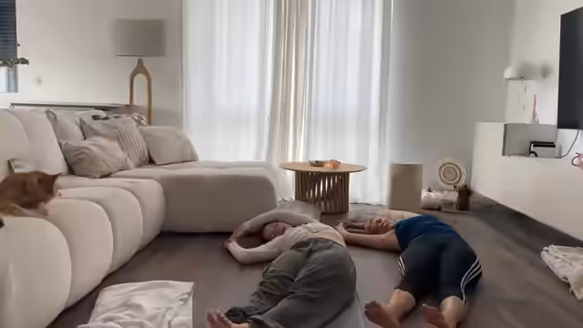 00:53:02Die Übungen verlagern sich auf den Oberkörper. Im Liegenden wird eine Banane-Übung durchgeführt, bei der der Oberkörper zur Seite gedreht wird, um die seitliche Muskulatur zu dehnen. Es folgen gezielte Nacken- und Schulterdehnungen, um Verspannungen im Bereich des oberen Rückens und des Nackens zu lösen und die Mobilität zu erhöhen.