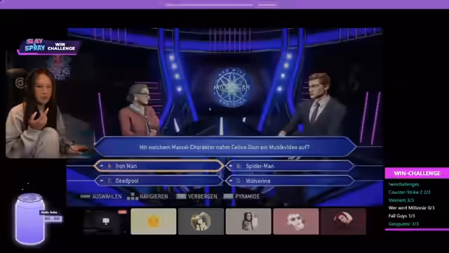 00:18:31Es wird darüber gesprochen, mit welchem Spiel begonnen werden soll und die Entscheidung fällt auf Counter-Strike (CS). Es werden zwei Wins in CS gefordert, was als eine große Herausforderung angesehen wird, da es sich um ein fremdes Setup handelt und die Teilnehmerin nicht einmal mit ihrem eigenen Setup spielen kann. Anschließend wird Valorant ausgelost, was ebenfalls als schwierig eingeschätzt wird. Es folgt "Wer wird Millionär", bei dem befürchtet wird, dass die Augenbrauen als Strafe herhalten müssen, falls die Herausforderung nicht gemeistert wird. Die Moderatorinnen scherzen über die Möglichkeit, den Chat als Joker einzusetzen. Es wird auch über die Farbe der Augenbrauen gesprochen, falls die Strafe eintritt. Fall Guys wird ebenfalls als Spiel ausgewählt. Insgesamt werden die Spiele Counter-Strike (2 Wins), Valorant (3 Wins) und Fall Guys (3 Wins) festgelegt. GeoGuessr wird ebenfalls gespielt. Es wird überlegt, Kanalpunktwetten zu veranstalten, um die Zuschauer an der Herausforderung teilhaben zu lassen.