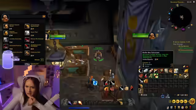 02:20:59Kurze Unterbrechung: Der Streamer isst Spaghetti und einen Protein-Rap mit Lachs und Tzatziki. Zurück im Spiel geht es um die Mage-Klasse: Diskussion von Frost- vs. Feuer-Spezialisierung, Auto-Attack-Nutzung und Mana-Regeneration. Verkauf überflüssiger Gegenstände bei Händlern wird geübt. Addons wie Questie für Quest-Verwaltung werden diskutiert, ebenso wie Berufe (Alchemie, Schneiderei) für den Hardcore-Mode.