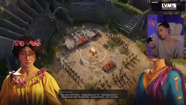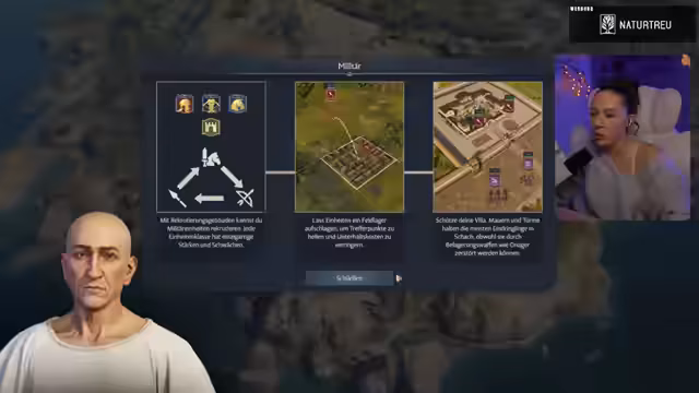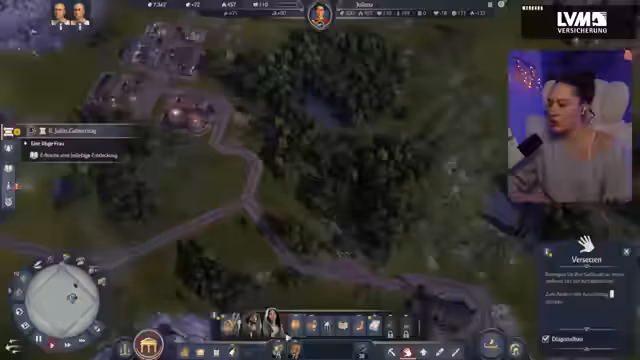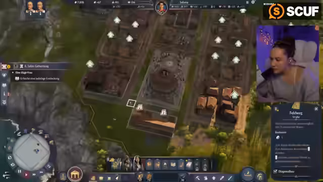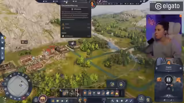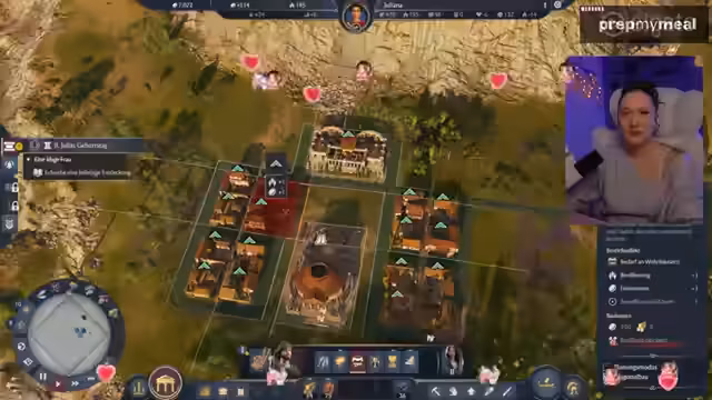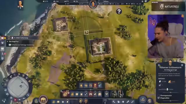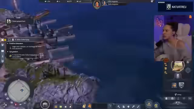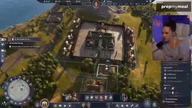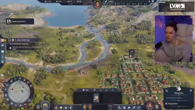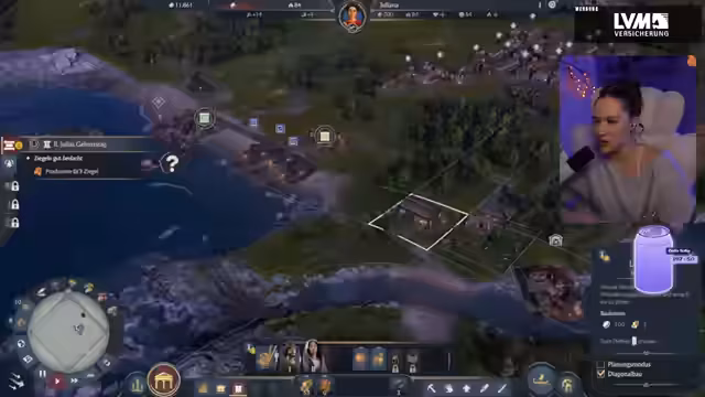 01:30:33Die Streamerin beginnt mit dem Bau der ersten Wohnsiedlung und der Infrastruktur in Anno 117: Pax Romana. Sie ist zunächst überfordert mit der Anordnung der Gebäude und der Gestaltung der Straßen, da sie Angst hat, Fehler zu machen. Der Chat gibt ihr den Tipp, dass Häuser später versetzt werden können, ohne sie abreißen zu müssen, was ihr Erleichterung verschafft. Sie baut Fischereien, um die Nahrungsmittelversorgung sicherzustellen, und ein Lagerhaus, um die produzierten Güter zu lagern. Kurz darauf erscheinen die ersten Bewohner in ihrer Stadt. Eine erste Audienz mit einem befreiten Sklaven, der Bretter transportiert, stellt sie vor die Wahl, ob sie nett oder streng reagieren soll. Sie entscheidet sich für eine freundliche Reaktion und wünscht ihm alles Gute. Während des Spiels wird ein Event-Trailer gezeigt, der die Teams für ein kommendes Battlefield-Event vorstellt, an dem die Streamerin teilnehmen wird. Sie äußert sich begeistert über ihr Team und freut sich auf das Event, bevor sie zum Städtebau zurückkehrt und sich weiter mit den Spielmechaniken auseinandersetzt.