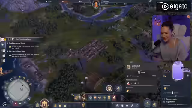 06:15:11Die Streamerin widmet sich der Gesundheit ihrer Bevölkerung und plant den Bau von Krankenhäusern, um die Versorgung zu verbessern. Es wird festgestellt, dass die Reichweite der Krankenhäuser nicht alle Wohnhäuser abdeckt, was zu Unzufriedenheit führen könnte. Die Forschung schreitet voran, und neue Technologien wie Wachtürme zur Erhöhung der Zufriedenheit und verbesserte Marktplätze werden freigeschaltet. Die Bilanz der Stadt schwankt, und es wird versucht, die Produktion von Hanf und Tuniken zu optimieren. Die kaiserliche Quest nimmt eine dramatische Wendung: Der Kaiser ist tot, und die Streamerin muss ein Grabmal für ihn errichten. Dies führt zu einer emotionalen Zeremonie mit Musik und der Platzierung von Baum- und Blumenornamenten sowie Obelisken. Nach der Bestattung kehrt die Streamerin zur Villa Augusta zurück, um die neuesten Nachrichten aus der Hauptstadt zu erfahren. Dort wird sie mit der Nachricht konfrontiert, dass ein neuer, scheinbar diktatorischer Kaiser namens Kalidus an die Macht gekommen ist, der ihr Flaggschiff konfiszieren will und sie ins Exil schickt.