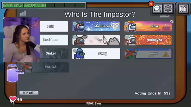04:08:45Nachdem Stefan vom Mordvorwurf freigesprochen wurde, wendet sich der Fokus auf Panda. Der Streamer hat mit seiner Tracker-Fähigkeit gesehen, dass Artix die ganze Zeit auf der linken Karte war und Panda sich auf der rechten Seite aufgehalten hat. Der Streamer äußert seine starken Bedenken gegenüber Panda und fürchtet, dass dieser der zweite Imposter ist und das Team sabotieren wird.