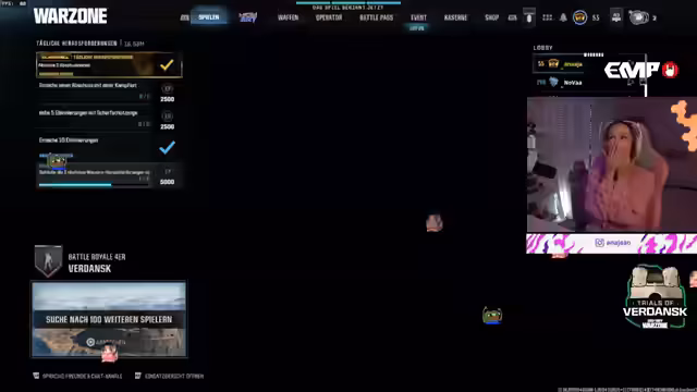 01:09:55Die Streamerin bereitet sich mental auf das bevorstehende 50.000$ EGL Trio Custom Turnier vor und äußert ihre Aufregung und Fokus auf das Spiel. Während des Warmups werden einige unglückliche Spielzüge mit der Waffe MX9 kommentiert, bei denen sie schnell eliminiert wurde. Im Gespräch mit dem Chat wird der Einsatz von Art of War Settings diskutiert, um die Spielsituation besser hören zu können. Parallel dazu werden persönliche Themen wie Umzugspläne und das Alleinleben angesprochen, was zu einem allgemeinen Austausch über Wohnsituationen und das Erwachsenwerden führt.