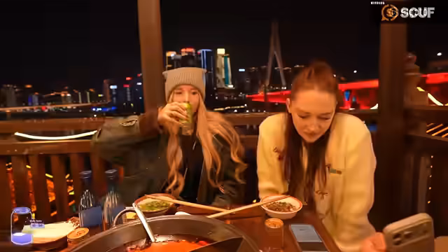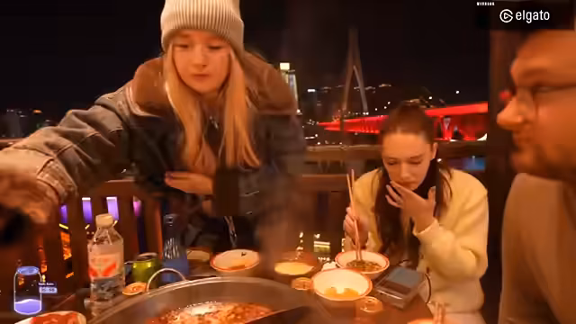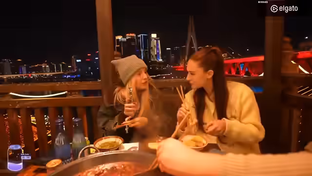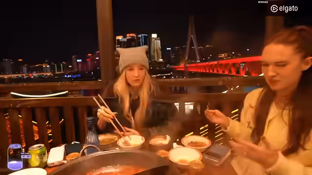 02:56:00Die Streamerin äußert ihre Freude darüber, dass das Live-Streaming in China möglich ist, und erklärt, dass Yannick extra mit dem chinesischen Konsulat in Deutschland gesprochen hat, um die Erlaubnis dafür zu erhalten. Sie vermutet, dass immer jemand von der Regierung ihren Stream verfolgt. Ihr Handy hat nur noch 2 % Akku, und sie bittet um eine Powerbank. Sie ist beeindruckt von der Architektur und den hohen Gebäuden in China. Es wird diskutiert, dass Streaming ohne Anmeldung in China eigentlich nicht erlaubt ist, da VPNs, die für den Zugriff auf Dienste wie Twitch benötigt werden, in einer Grauzone liegen. Die Streamerin äußert den Wunsch, einmal die 'Ghibli-ähnliche' Landschaft zu sehen und hofft, dass das Internet auf einer Brücke funktioniert, auf die sie sich begeben. Sie ist überwältigt von der Aussicht, die sie als 'Studio Ghibli' und 'Cyberpunk City' beschreibt, und bekommt Gänsehaut. Sie versucht, Panoramabilder zu machen, um die beeindruckende Szenerie festzuhalten. Es wird überlegt, authentisch Hot Pot mit Blick auf die Stadt zu essen. Sie bemerken, dass das Internet auf der Brücke nicht gut ist und dass es in China für fast alle westlichen Apps eine asiatische Alternative gibt, wie WeChat für WhatsApp und Alipay für PayPal. Sie fahren mit einem Aufzug in ein Restaurant, um Hot Pot zu essen, sind aber enttäuscht, dass es keinen Platz am Fenster gibt, wo das Internet besser wäre. Sie beschließen, ein anderes Restaurant mit schöner Aussicht am Fluss zu suchen, um Yannick zu entlasten, der viel Technik schleppt. Sie entdecken Mangosteen, eine Frucht, die in Deutschland teuer ist, hier aber günstig. Sie bemerken, dass die Temperatur bei etwa sieben bis zehn Grad liegt und dass der Flug entspannt war.