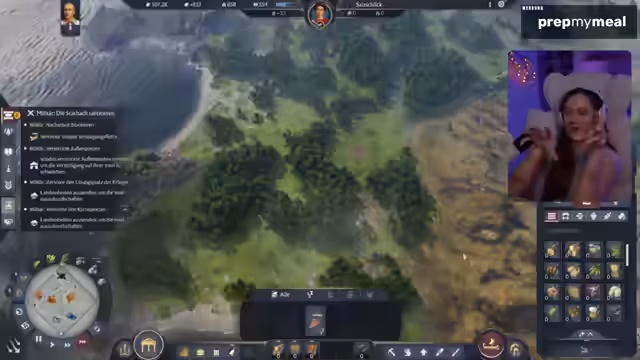 10:11:16Die Streamerin entdeckt das Handels- und Ressourcenmanagementsystem neu. Sie erkennt den Vorteil des Handels anstelle der Eigenproduktion und setzt automatische Kauforders für knappe Ressourcen wie Seile ein. Dies führt zu einer finanziellen Blüte und sie erklärt das System dem Chat, während sie gleichzeitig über die Notwendigkeit weiterer Bauern für den Schiffsbau nachdenkt.
