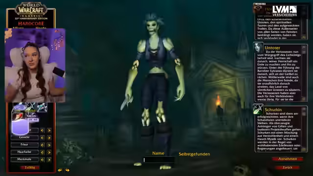 00:13:30Die Streamerin startet das Spiel und die gemeinsame Charaktererstellung mit Jasmin. Schnell stellt sich die kritische Frage der Fraktionswahl, die den weiteren Verlauf des Streams maßgeblich beeinflusst. Die Streamerin ist fest im Allianz-Lager verankert und zeigt Ablehnung gegenüber der Horde. Jasmin hingegen bevorzugt die Horde, was zu einer ernsten Diskussion führt. Nach langem Ringen einigt man sich auf die Horde, um im selben Startgebiet zu starten, was jedoch die Charakterwahl einschränkt.