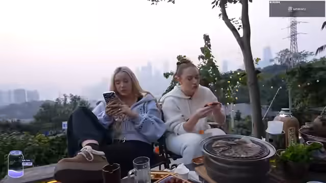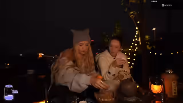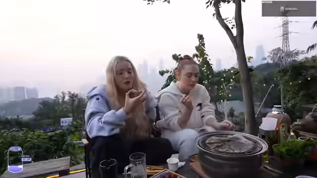 00:13:46Nach den technischen Startschwierigkeiten befinden sich die Streamerin und Janik in einem traditionellen Teehaus mit einer beeindruckenden Skyline-Aussicht. Sie haben traditionellen Tee und ein Barbecue bestellt. Das Essen wird detailliert beschrieben, darunter Chicken Wings, verschiedene Fleischsorten, Lauchzwiebeln, Inoki-Pilze, Süßkartoffeln und Shrimps. Die Zubereitung erfolgt auf einem kleinen Grill direkt am Tisch, was die interaktive und authentische Atmosphäre des Erlebnisses unterstreicht. Die Streamerin genießt die Mahlzeit und die besondere Umgebung, die sie als einzigartig und beeindruckend beschreibt.