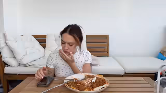 02:12:42Nachdem das Yaglama fertig gekocht ist, wird es mit selbstgemachtem Fladenbrot serviert. Die Streamer zeigt, wie das Gericht angerichtet wird: Brot wird in die Sauce getunkt, mit Hackfleisch belegt und mit einem Schnitt in der Mitte versehen, um es später mit einer Gabel aufzurollen. Das Essen wird als 'türkische Lasagne' bezeichnet und ist bei allen sehr beliebt. Während des Essens wird die Technikproblematik des Streamings thematisiert, da nur eine funktionierende Steckdose zur Verfügung steht.
