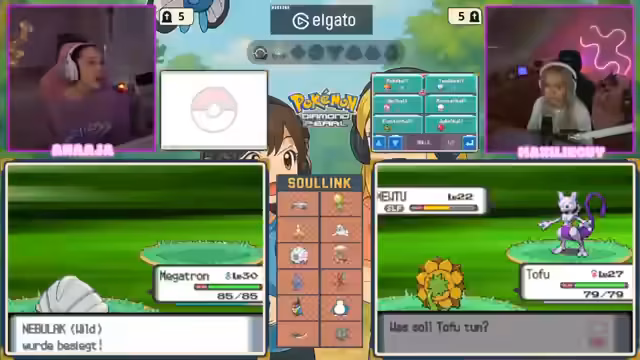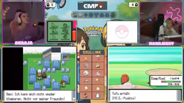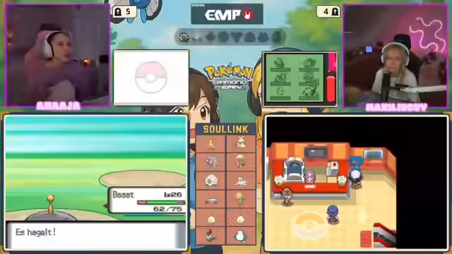 00:26:09Nach dem intensiven Gespräch über das Thema Spenden wechselt die Streamerin zum eigentlichen Inhalt des Streams. Sie startet den Nintendo DS-Emulator und beginnt ein Pokémon-Spiel aus der Diamant-Perl-Generation. Ein Co-Streamer, Maxi, stößt zum Spiel hinzu, und das Setup mit der Bildschirmübertragung wird technisch vorbereitet. Das Spiel beginnt mit einer zufälligen Pokemon-Aufstellung (Randomizer).