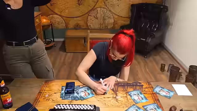 01:41:28Das finale Rätsel erfordert, dass drei Porträts basierend auf ihren Eigenschaften (Betende, Musiker, Bruder) korrekt miteinander verbunden werden. Nachdem dieses Rätsel gelöst ist, erscheint ein Zauberausweis, der den Erfolg der Mission bestätigt. Die Streamerinnen haben das Mystery Room nach etwa einer Stunde 15 Minuten bewältigt und feiern diesen Sieg, der mit viel Aufwand und der Hilfe der Zuschauer erreicht wurde.