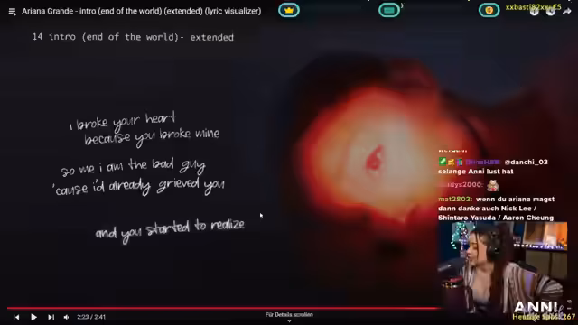 01:28:52Die Streamerin teilt persönliche Gedanken und Gefühle zu den Lyrics der Songs von Ariana Grande. Sie spricht über Beziehungen und wie sie selbst mit Trennungen umgeht. Die Streamerin zeigt, dass die Texte von Ariana Grande oft universelle Themen ansprechen und sie manchmal den Eindruck haben, dass diese Songs direkt aus ihrem Leben stammen. Sie teilt auch ihre persönlichen Erfahrungen mit dem Schreiben von Songs und wie sie ihre eigenen musikalischen Projekte sieht.