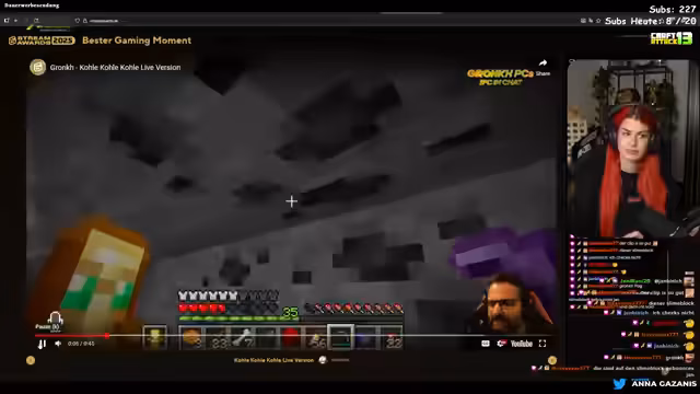 04:34:57Die Streamerin äußert ihren Unmut über den Chat, bezeichnet ihn als 'Kacke' und schlägt humorvoll einen Stream Award für den 'dümmsten Chat' vor, den sie jedes Jahr gewinnen würde. Sie verteidigt sich gegen die Behauptung, der Chat sei ein Spiegelbild des Streamers, und es kommt zu einer scherzhaften Beleidigung der Zuschauer als 'Rechtsradikale'. Die Diskussion wechselt dann zu den Vorbereitungen für den Kampf gegen den Enderdrachen. Es werden Rüstungen und Verzauberungen besprochen, und es stellt sich heraus, dass die Farmen durch einen Fehler im Spiel kaputtgegangen sind. Die Spieler diskutieren die Strategie für den Kampf, insbesondere die Heilmechanismen des Drachen und die Rolle der Kristalle. Es werden Witze über die Schwierigkeit des Spiels und die mangelnde Koordination der Spieler gemacht.