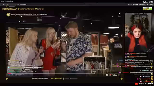 01:47:32Die Kategorie 'Bester Awkward Moment' wird vorgestellt, die Clips sammelt, die für Gänsehaut sorgen. Ein Beispiel ist die Geschichte einer verfolgten Streamerin, die von Schülern am Buckingham Palace bis zu einem Restaurant verfolgt wird, wobei die Lehrerin schließlich eingreift, um Fotos zu ermöglichen. Ein weiterer Clip zeigt einen schüchternen Fan, der einem Streamer begegnet, was als 'traurig' und 'asozial' empfunden wird, da die Schüchternheit des Fans als 'awkward' dargestellt wird. Die Streamerin äußert ihr Mitgefühl für solche Fans und kritisiert die Darstellung dieser Momente. Es wird auch über 'Basu' gesprochen, der an 'Sally' erinnert und eine skurrile Szene mit Spaghetti Bolognese auf dem Bauch inszeniert, was als 'wild' und 'lustig' beschrieben wird.