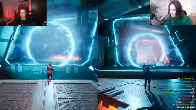 02:56:09Das Spiel schlägt in ein anspruchsvolles Level um, bei dem die Streamerin und ihr Partner auf einem dunklen Parcours jeweils auf einer Farbe basierenden Spur springen müssen. Die Schwierigkeit liegt darin, das Timing ihrer Sprünge perfekt abzustimmen, um nicht in Fallen zu geraten oder in Laser zu teleportieren. Sie müssen zusammenarbeiten, indem sie sich gegenseitig hochkatapultieren und wechselweise in den anderen springen, um den Parcours erfolgreich zu bewältigen.