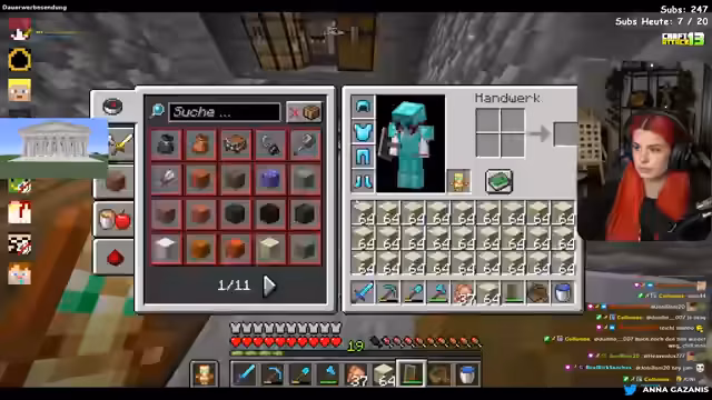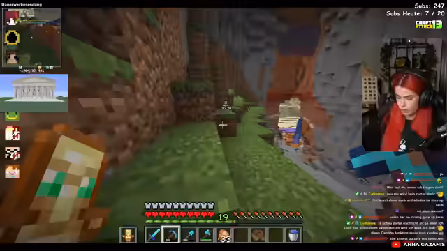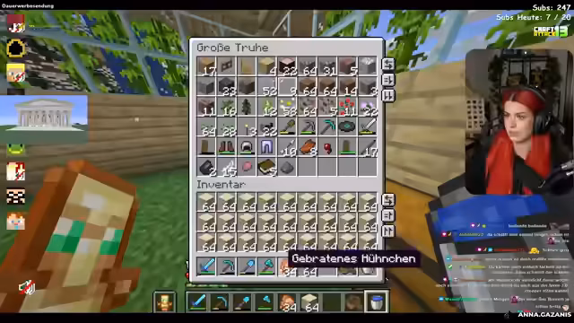 02:12:21Die Streamerin fragt nach der Funktion des Totems und erfährt, dass es in der Offhand getragen werden muss, um den Tod zu verhindern und zu heilen. Sie ist besorgt, dass sie nicht blocken kann, wenn ein Creeper angreift, und überlegt, wie sie im Falle eines Lava-Sturzes reagieren soll. Die Streamerin betont die Wichtigkeit der Gesundheit, da Geld und Materialien ersetzbar sind, die Gesundheit jedoch nicht. Sie erinnert sich an eine Situation, in der ein Spieler nach dem Disconnect ein Totem verloren hat, und plant, im Notfall schnell die Verbindung zu trennen. Die Streamerin fragt nach der Mission des Totems im echten Leben und stellt sich vor, wie toll es wäre, wenn es auch dort funktionieren würde. Sie diskutiert mit den Zuschauern über die Funktion von Endermen und deren Fähigkeit, Blöcke aufzunehmen. Die Streamerin plant, einen „OP-Bogen“ zu machen und XP zu farmen, um Emeralds zu sammeln und ihre Waffen zu verbessern. Sie erhält selbstgemachte McMuffins als Essen und ist begeistert. Ein Reel, das sie auf Instagram hochgeladen hat, erhielt dort nur 100 Aufrufe, auf Facebook jedoch eine Million, was sie überrascht. Sie erhält weitere Totems und bedankt sich dafür. Die Streamerin hat immer noch keinen Hunger und fragt, ob ihr Körper aufgrund des geringen Essens nicht mehr richtig funktioniert. Sie gönnt sich Moltebeeren-Marmelade, die sie als exotisch beschreibt und die einen leicht bitteren Geschmack hat. Sie fragt die „Essensexperten“, was sie essen soll, und erhält Vorschläge wie M&M's, Kinderriegel, Brot, Brötchen, Schokobrezeln, Instant Ramen und Toastkäse. Sie bereitet Instant Ramen mit Wasser in einer Schüssel zu.