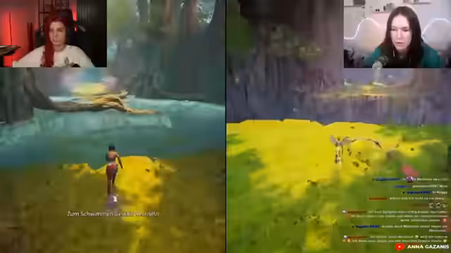00:48:57Anna und Melanie schaffen es schließlich, die Streaming-Software einzurichten und ihre Kamerabilder gemeinsam sichtbar zu machen. Nachdem Melanie Anna in das Spiel eingeladen hat, beginnen sie mit 'Split Fiction'. Beide kennen die Storyline nicht und erleben einen unmittelbaren Konflikt im Spiel, bei dem ihre Charaktere in eine fiktive Simulation geraten und sich gegenseitig um Hilfe bitten müssen.