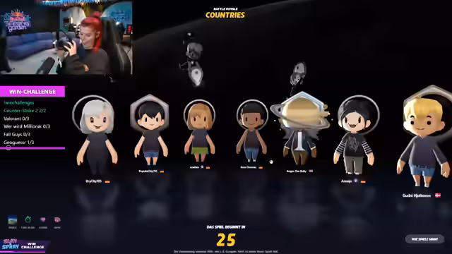 00:11:02In München im Red Bull Gaming Garden startet eine Win-Challenge. Es wird betont, dass die Teilnehmenden zwar keine Profis in den einzelnen Spielen sind, aber zumindest jemand eine gewisse Erfahrung mitbringt. Die Spiele umfassen CS, Wer wird Millionär (im Battle Royale Modus), Vollgeist und Geoguesser. Das Ziel ist es, in jedem Spiel die Beste in der Runde zu sein. Es wird überlegt, wie viele Siege in jedem Spiel erforderlich sind und welche Strafen es geben wird, wobei das Blondieren der Augenbrauen als mögliche Konsequenz genannt wird. Die Anzahl der benötigten Siege pro Spiel wird ausgelost, wobei bis zu drei Siege pro Spiel möglich sind. Countless Choice wird als das potenziell schwierigste Spiel mit drei erforderlichen Siegen angesehen, während Vollgeist als entspannter eingeschätzt wird.