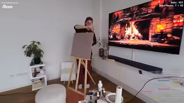 03:03:22Nachdem das Mittagessen im Ofen ist, verlagert sich der Stream in das Wohnzimmer, wo die Streamerin mit einem neuen Hobby beginnt: Malerei. Sie bereitet eine Staffelei und eine quadratische Leinwand vor, um ein Bild für ihre Schwiegermutter zu erstellen. Sie wählt eine gold-beige Farbpalette und beginnt mit der Grundierung, was zu technischen Schwierigkeiten und einem Misserfolg führt, da die Basis zu dunkel wird. Trotz anfänglicher Unzufriedenheit entscheidet sie sich, den Prozess fortzusetzen und das Bild mit Gold-Akzenten zu retten, während sie gleichzeitig über ihre vielen Hobbys und die Schwierigkeit, sich auf eine Sache zu konzentrieren, spricht.