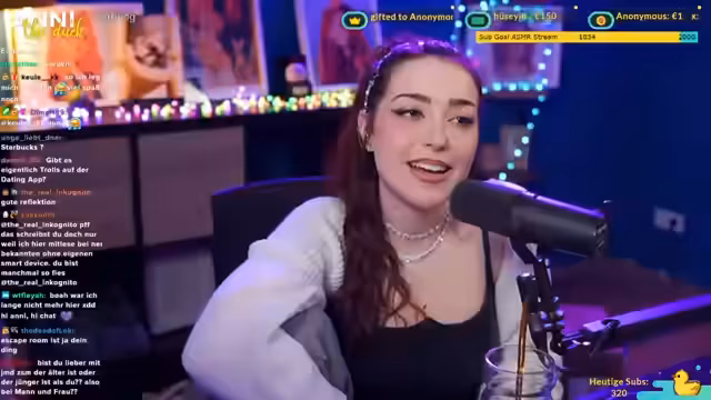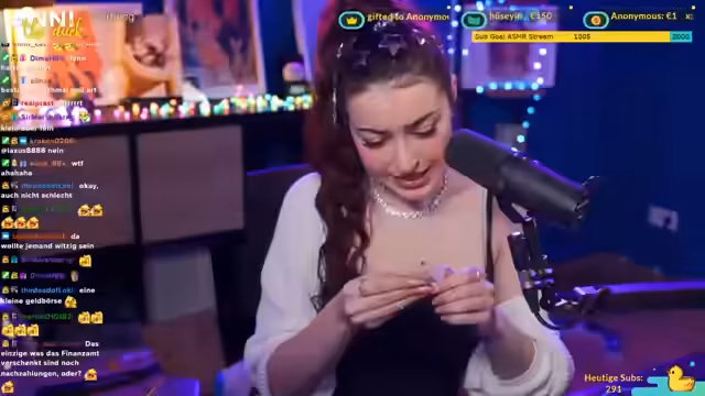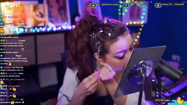 01:40:51Der Stream beginnt mit dem Versuch, ein Piercing an der Ohrmuschel zu wechseln. Die Streamerin beschreibt sich als Meisterin in dieser Handlung, findet jedoch den Vorgang aufgrund ihrer langen Nägel schwierig. Nachdem sie erfolglos versucht hat, das neue Piercing einzuführen, bricht sie kurz auf, um sich einen Spiegel und passende Greifzangen zu holen. Sie äußert die Sorge, dass ihre Katze in die Aktion eingreifen könnte, und betont, dass sie trotz der Herausforderungen am Ziel festhält.