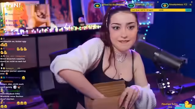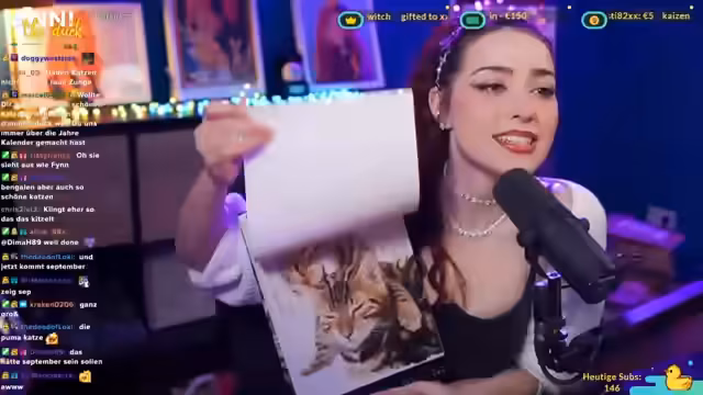 01:21:07Nachdem die Streamerin den Zuschauern erklärt hat, wie sie Fanart oder Geschenke per Post erhalten kann, beginnt sie, die Pakete aus der Wishlist auszupacken. Sie zeigt große Begeisterung über die erhaltenen Artikel, darunter ein personalisiertes Kalender mit Fotos der Streamerin und sogar ein Bengalen-Kissen. Bei einem von Dima geschenkten Plastikspielzeug für ihre Katze Finn kommt es zu einem kleinen Zwischenfall, da die Katze daran zu verschlucken droht. Auch persönliche Schmuckstücke wie Ohrringe werden vorgeführt.
