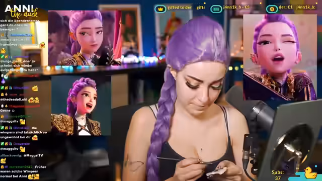 01:55:34Die Streamerin zeigt sich mit dem Ergebnis zufrieden, zieht jedoch Rückschlüsse für zukünftige Cosplays. Für Rumi benötigt sie andere Wimpern, die kürzer im inneren Auge sind, und einen matteren, goldfarbenen Lidschatten mit mehr Glitzer. Als positives Detail hebt sie hervor, dass der Charakter dunkle Augen hat, was das Tragen von Kontaktlinsen überflüssig macht. Zum Schluss spricht sie über Pläne für ihr erstes Musikvideo und kündigt einen Stream am nächsten Tag an.