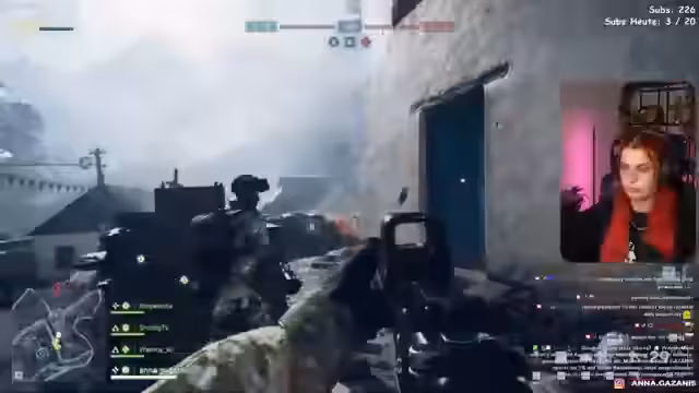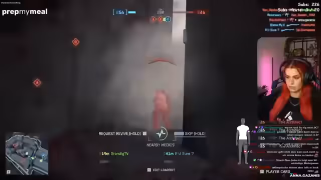 01:58:51Während des Spiels zeigt die Streamerin intensive Emotionen und reagiert sowohl auf Erfolge als auch auf Rückschläge mit emotionalen Ausbrüchen. Sie interagiert aktiv mit ihrem Team, versucht Gegner zu pingen und revivt Kameraden, wobei sie sich teilweise überfordert fühlt. Ihr Kommentar ist geprägt von schneller Aktion, Frustration über den Überblickverlust auf der Map und wiederkehrenden technischen Audio-Problemen, wenn sie den Controller anschließt.