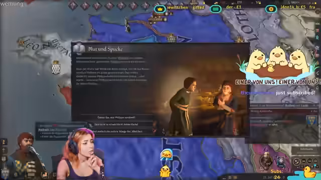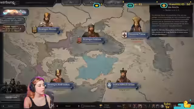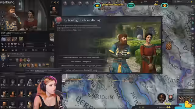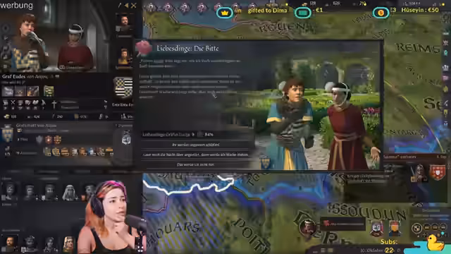 00:33:34Es wird als zehnjähriger Graf Eudes von Anjou in Frankreich gestartet. Eudes ist noch unverheiratet, hat aber eine 24-jährige Halbschwester. Es wird versucht, mit der Machtteilung klarzukommen, wobei die Herzogin Konstanz Eudes nicht mag. Es wird erklärt, was Ansprüche auf Titel bedeuten und wie man sie nutzen kann. Eudes wird als herrisch, zynisch und ruhig beschrieben. Es wird versucht, die 24-jährige Schwester zu verheiraten, aber die Regentin ist nicht treu genug, um zuzustimmen. Die Schwester wird als nutzlos bezeichnet. Es werden Hofämter vergeben, aber die Schwester ist als Ratsspitze ungeeignet. Ein fremder Mann namens Avomai wird vorgestellt und als Höfling eingestellt. Es wird ein Leibarzt benötigt, aber alle verfügbaren sind schrecklich. Avomai wird zum Hofarzt gemacht. Es wird überlegt, einen Komplott zu schmieden oder Krieg zu erklären. Ein Bündnis mit dem Bruder wird ausgehandelt. Es wird ein Regiment stationiert. Die Zeit wird schneller laufen gelassen und ein Bündnis geschlossen.