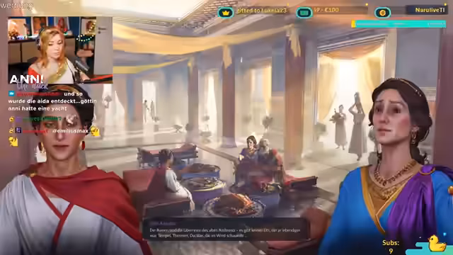 00:56:38Die Spielerin baut eine Villa und muss sich mit den Anforderungen für die Rekrutierung von Militäreinheiten auseinandersetzen. Währenddessen wird der Geburtstag von Kaiserin Julia vorbereitet, wofür festliche Vorhänge benötigt werden, die nur von den Frauen aus Lilibion gewebt werden können. Die Spielerin wird in die politischen Intrigen um Kaiser Syrakos verwickelt, der als skrupelloser Sklavenhalter beschrieben wird. Es wird enthüllt, dass die Spielerin mit einer Leiche verheiratet wurde, was sie schockiert und ihren Zorn entfacht. Eine persönliche Krise führt dazu, dass die Spielerin den Stream unterbrechen muss, da sie sich körperlich unwohl fühlt, möglicherweise aufgrund des Kostüms oder einer plötzlichen Erkrankung. Dies führt zu einer vorzeitigen Beendigung des Streams, mit der Hoffnung, später wieder live gehen zu können.