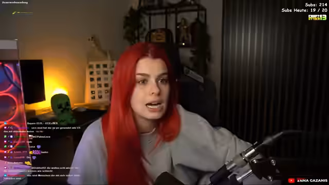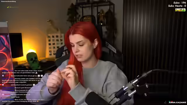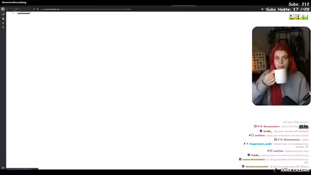 00:00:36Anna ist nach einer Krankheit zurück und beschreibt ihren aktuellen Zustand mit anhaltendem Übelkeit, Kopfschmerzen und einem schlechten Allgemeinbefinden. Sie plant, den Stream lange zu gestalten, hat jedoch um 15 Uhr einen Termin. Über die genauen Inhalte des Streams ist sie sich noch unsicher und erwägt Minecraft, Reactions oder einfach nur Unterhaltungssprechchats.