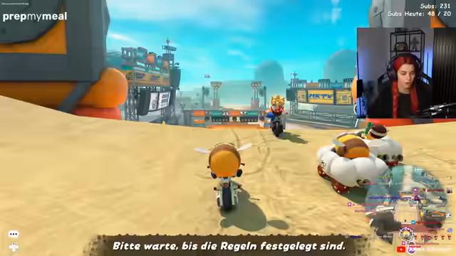 00:49:54Nach der Präsentation wechselte Anna zum geplanten Gameplay. Gemeinsam mit der Streamerin Wanda startete sie einen Mario Kart Stream auf der Nintendo Switch. Dabei kam es zu technischen Problemen: Anna konnte keinen Ingame-Sound hören, was das Spielen erschwerte. Sie diskutierte mit dem Chat über mögliche Lösungsansätze wie die Einstellung in der OBS-Software und fragte nach einem professionellen Controller, da sie der Meinung war, dass dies die Leistung verbessern könnte. Auch eine mögliche Mehrspielerpartie mit der Community wurde thematisiert.