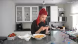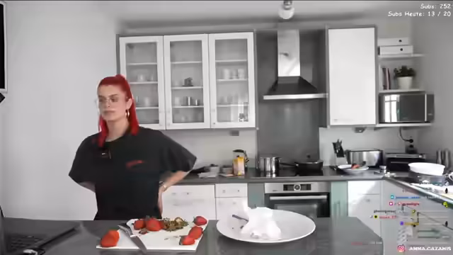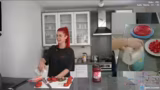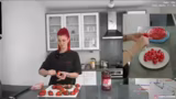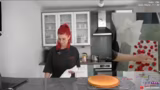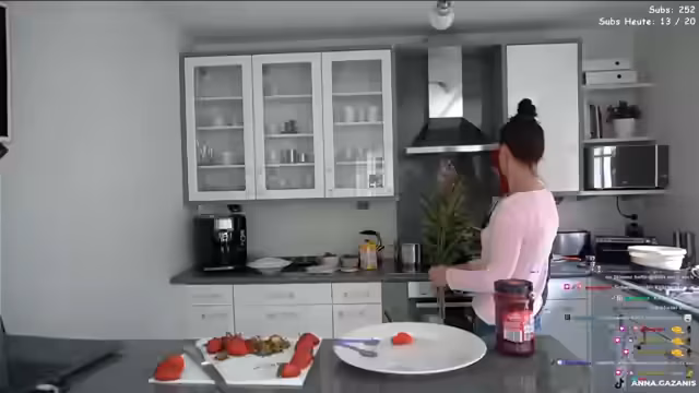 02:41:48Die fertige Vanillepuddingcreme wird auf den Kuchenboden gestrichen, wobei ein Rand freigelassen werden muss. Die Erdbeeren werden darauf gesetzt und der rote Tortenguss wird aufgetragen. Während des Auftragens stellt die Streamerin fest, dass der Kuchen optisch nicht gelungen ist und zu viel Vanillepudding enthält. Sie gibt zu, dass es sich um den hässlichsten Kuchen handelt, den sie je gemacht hat, und entschuldigt sich für das Aussehen.
